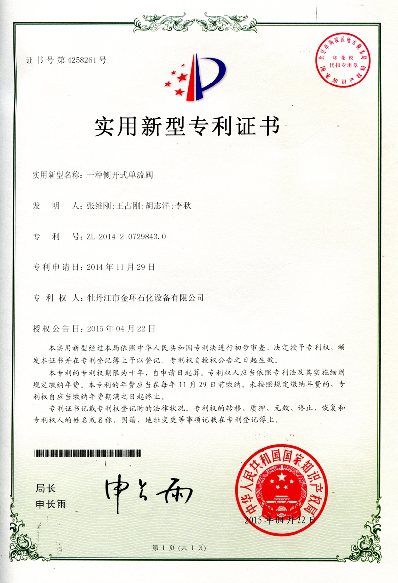 一種側(cè)開式單流閥實(shí)用新型專利證書ZL 2014 2 0729843.0